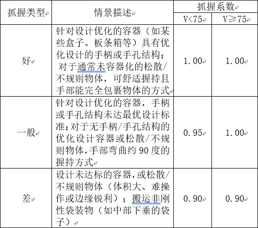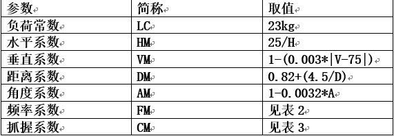 修订版NIOSH提举方程中常用的推荐重量限值(Recommended Weight Limit ,RWL)和提举指数(Lifting Index ,LI)。
