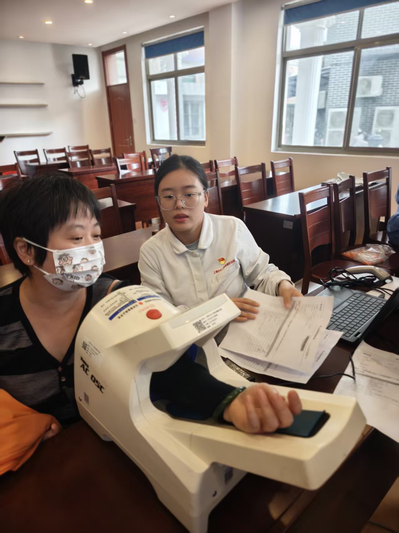 10月22日上午,我院健康监护联合党支部与金山高新区红叶居委会党支部开展了区域化党建结对活动。健康监护联合党支部的医务人员为当地居委四十余名志愿者、居民进行了免费健康检查和专业医疗咨询服务,受到红叶居委的热烈欢迎和一致好评。通过多年的基层党支部党建结对活动,真正实现了双方融合共建、优势互补、共同提高、服务群众的目的。