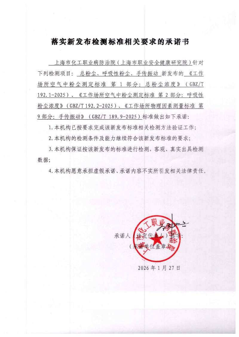 职业卫生技术服务机构落实新发布检测标准承诺书